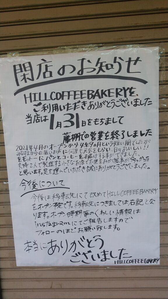 藤棚商店街で親しまれてきた「HILLCOFFEEBAKERY」が、移転のため現在の店舗での営業を終了されました。